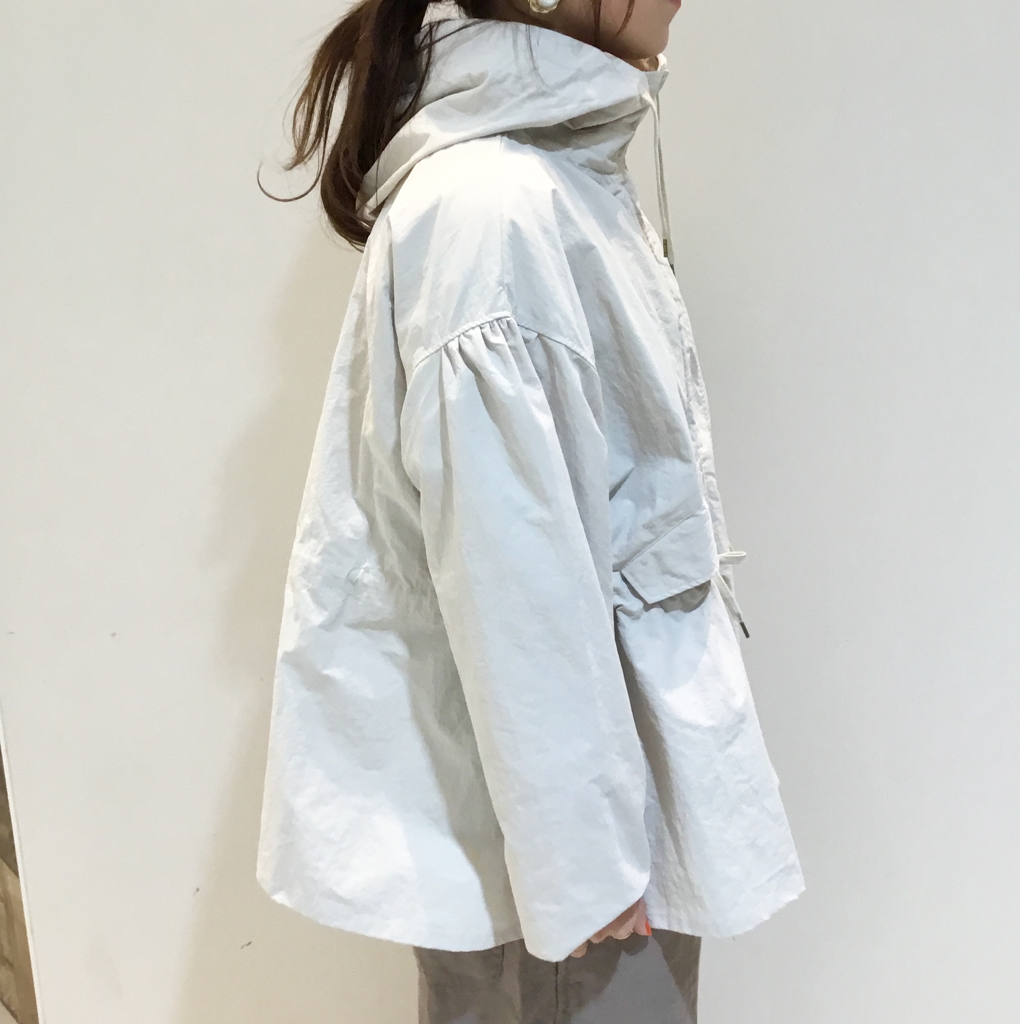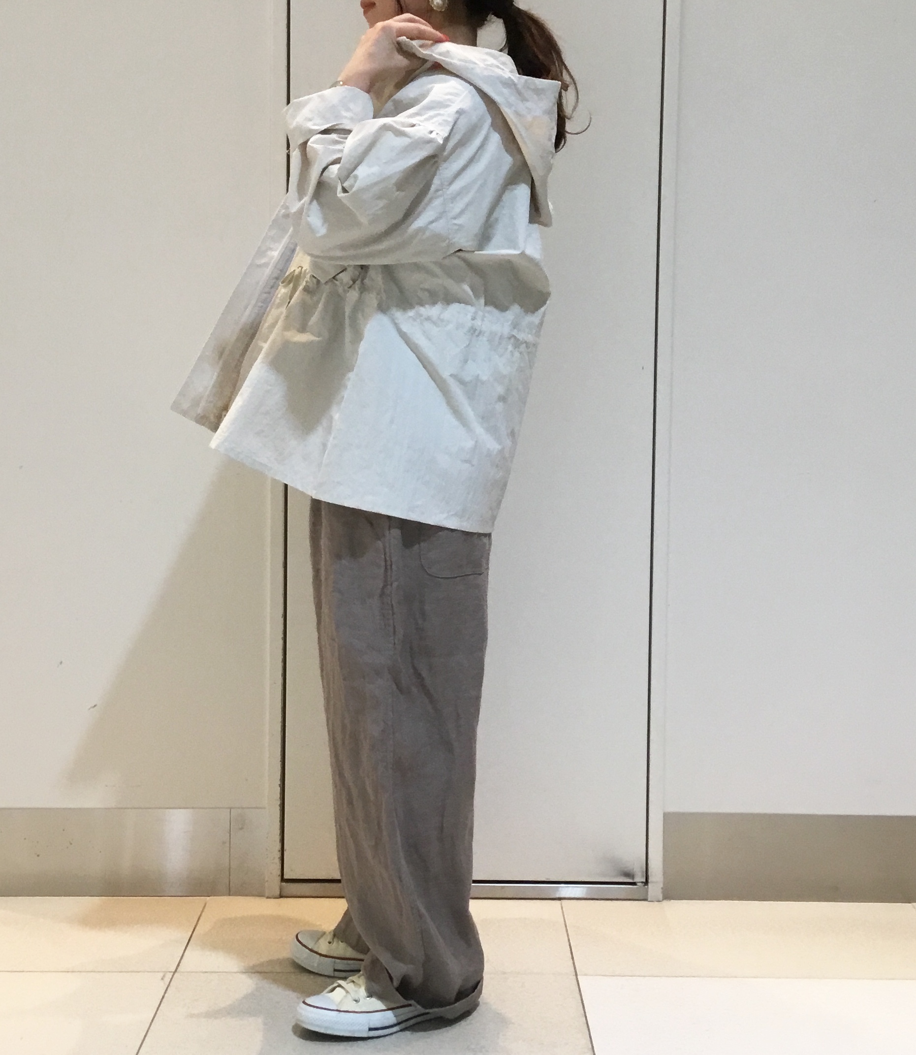 ミリタリーテイストのジャケットも淡いカラーを選んで柔らかな雰囲気でリラックス感も♪