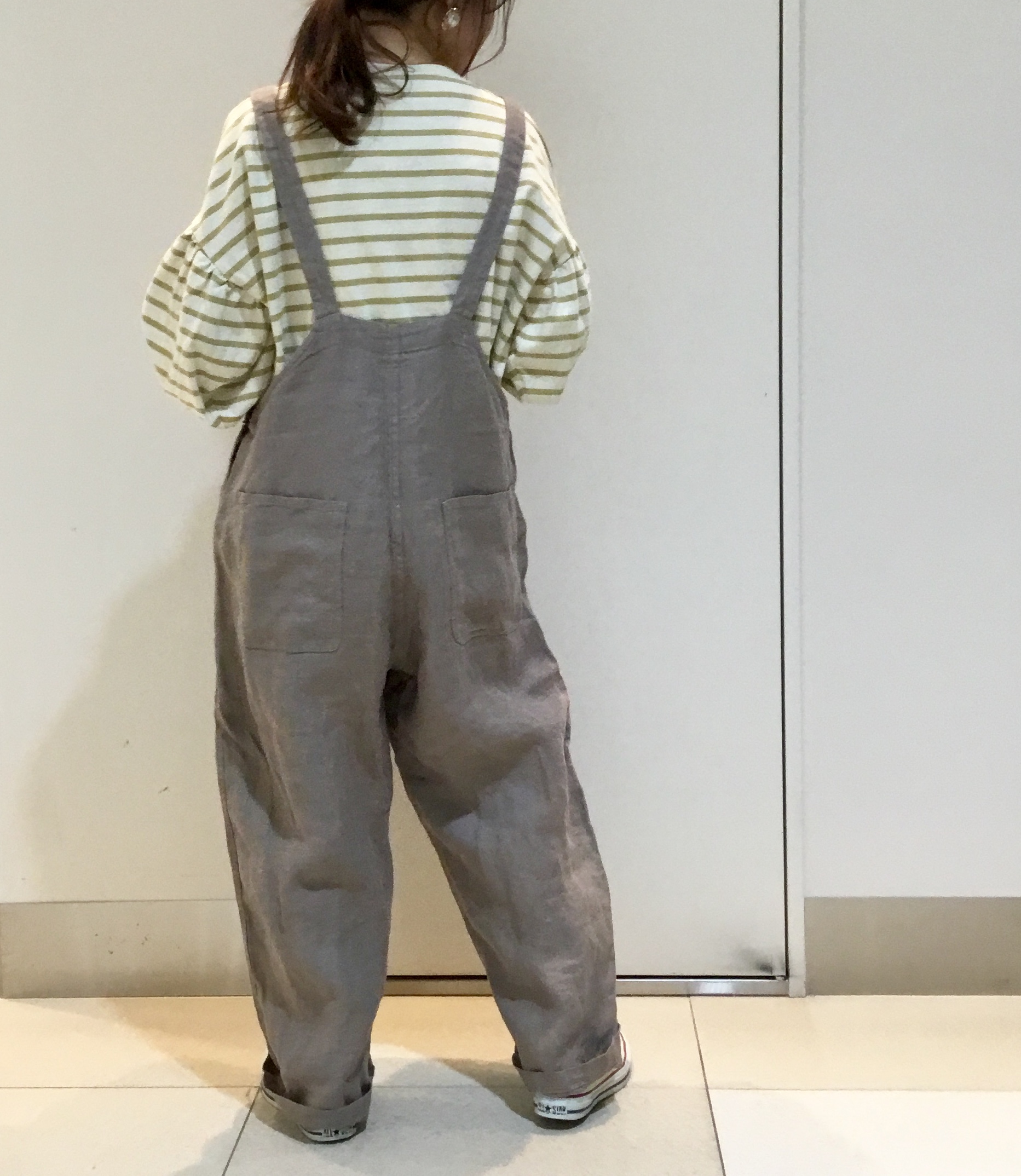 リネンサロペット×ボーダーにナイロンブルゾンでスポーティーさを少しだけ取り入れたスタイル。