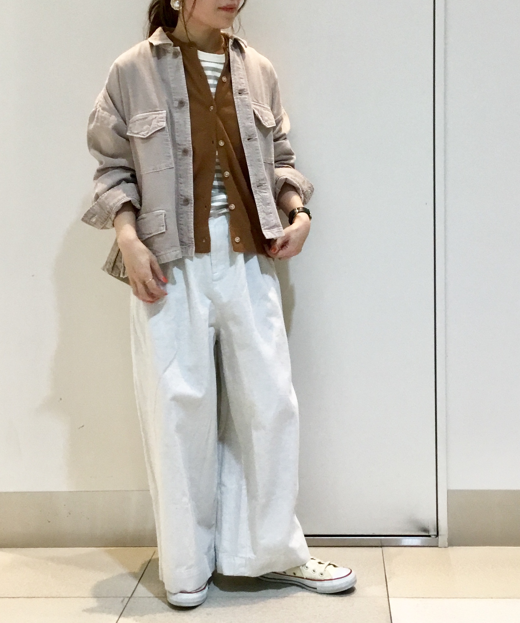インナーにブラウンのカーディガンを使用し赤みをプラスすることで温かみのあるスタイルに。