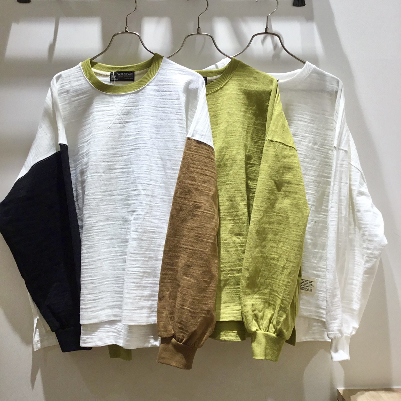 綿100%の柔らかいスラブ天竺で、トレーナーとTシャツの間の様な、季節の変わり目にピッタリのトップスです。