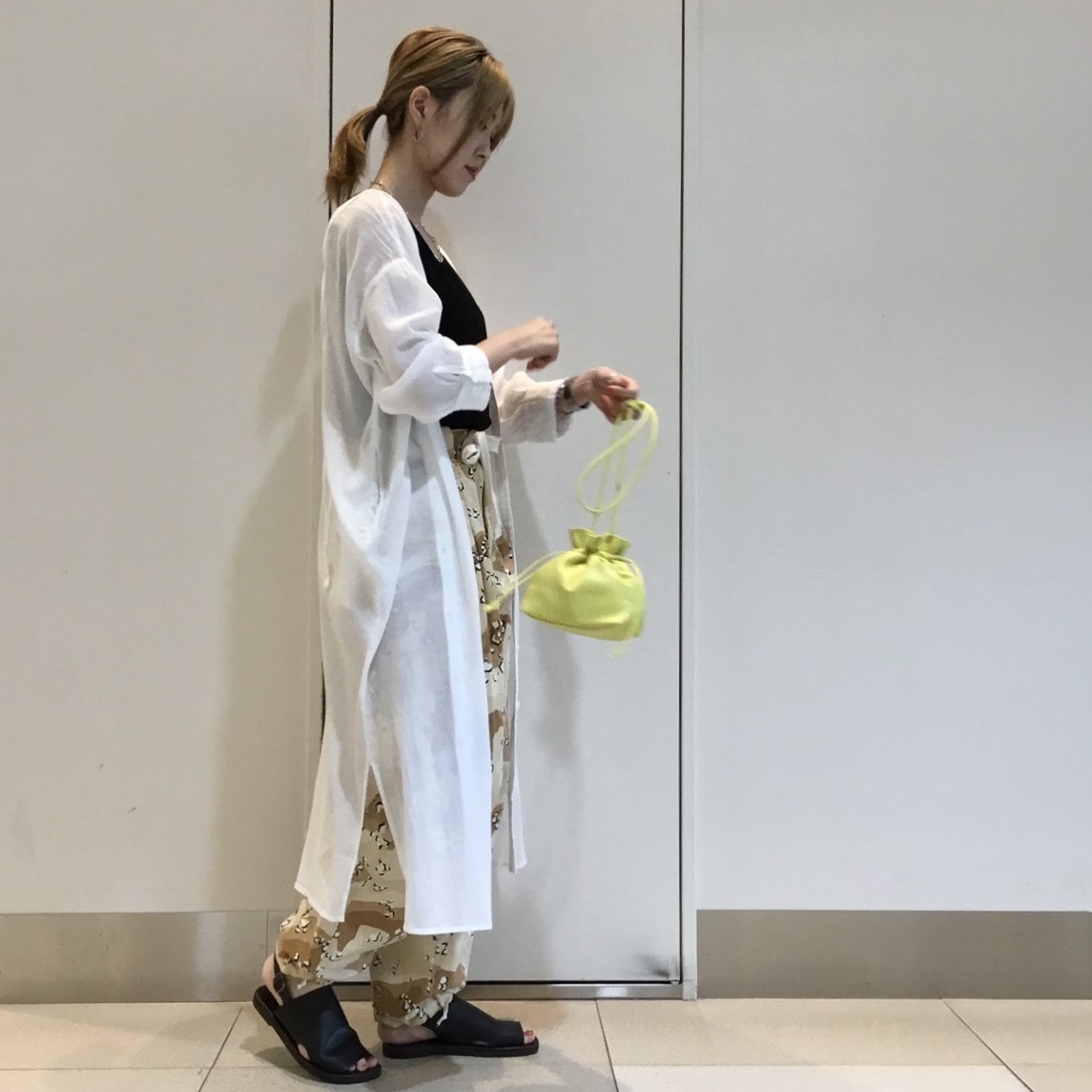 敢えてリラクシーで甘めなシアーシャツワンピースを合わせ、女性らしさをプラスしたコーディネートです。