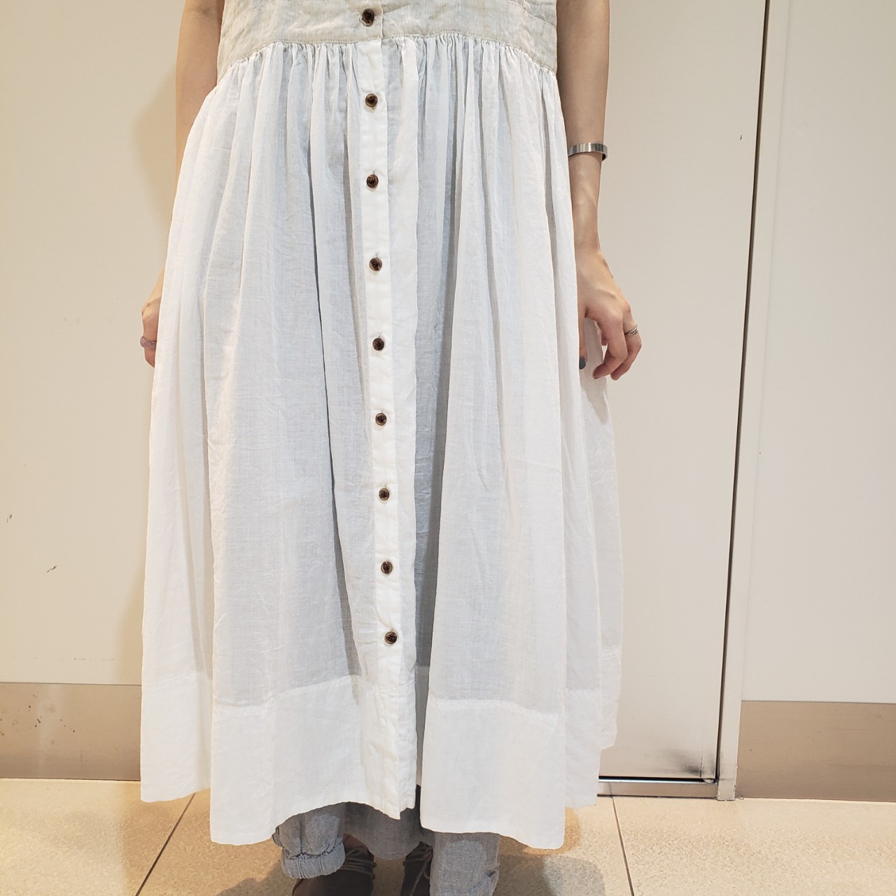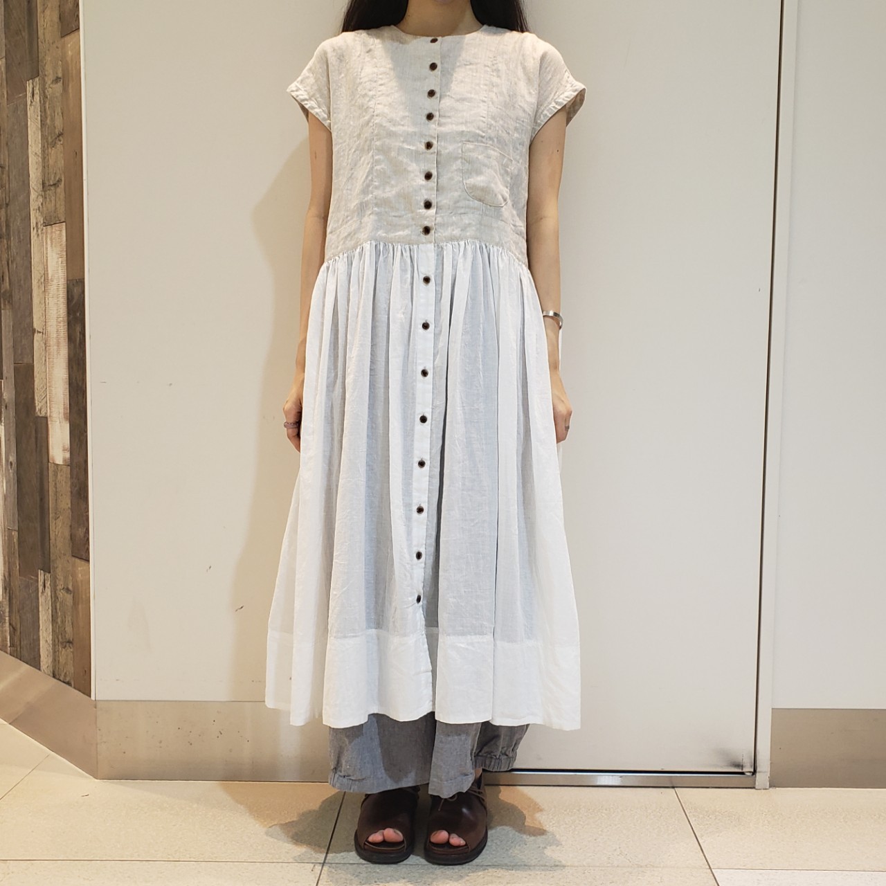 フレンチリネンと綿素材で切替になっているワンピース。