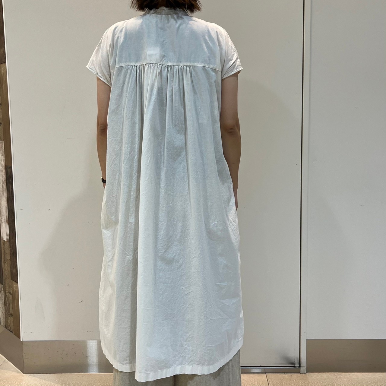 首元はバンドカラーですっきりと合わせやすく、背中のギャザーでふんわりと広がるシルエットは身体ラインを拾いません。