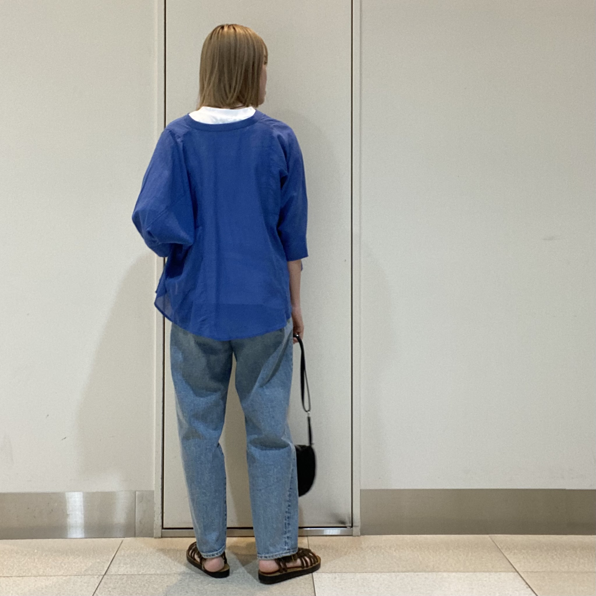 大人カジュアルに淡色デニムとワントーンで合わせたブルーコーデです。