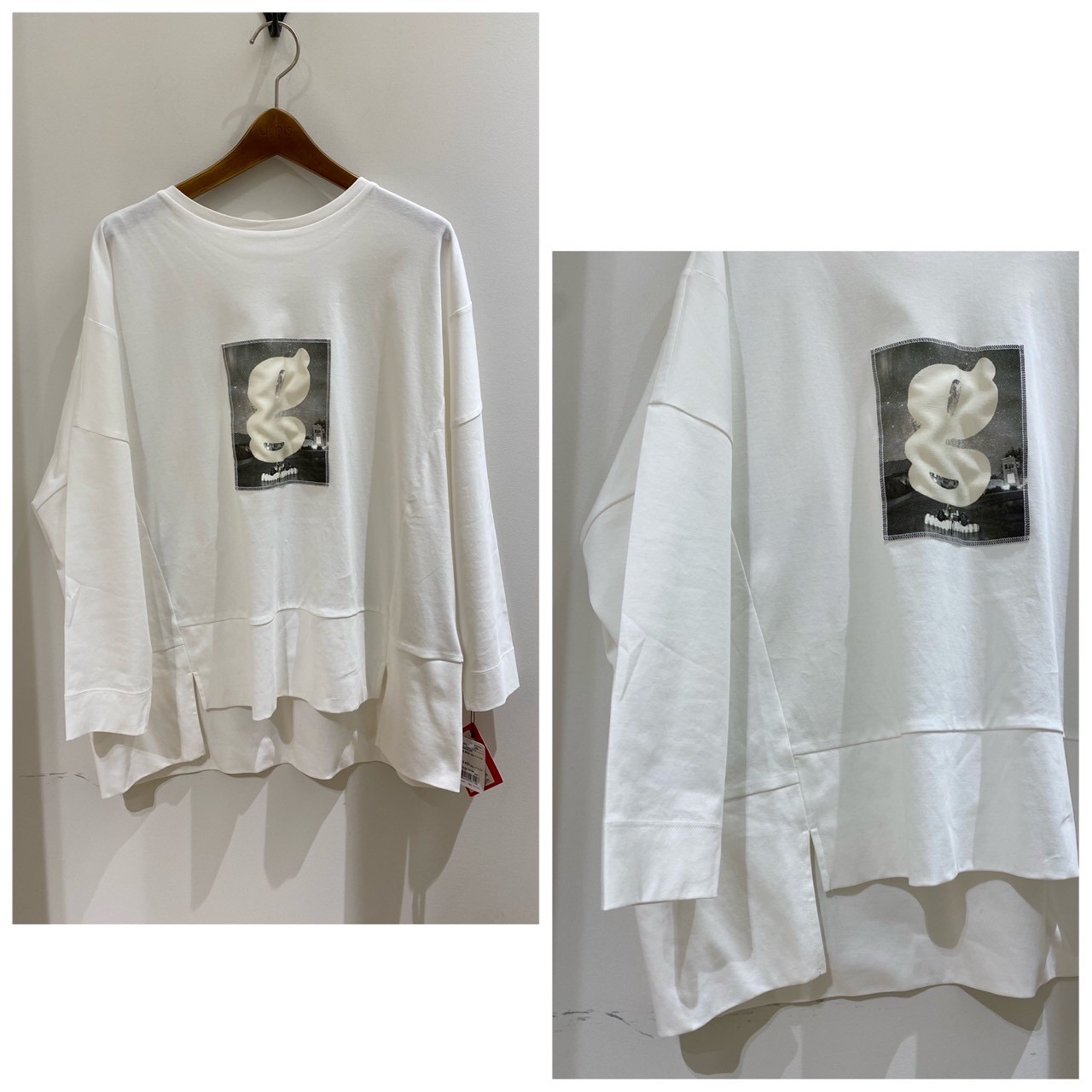上品な光沢感のあるシルケットスムースのきれいめカットソー素材。前後差の切替えデザインで、ゆったりしたサイジングの一枚着。