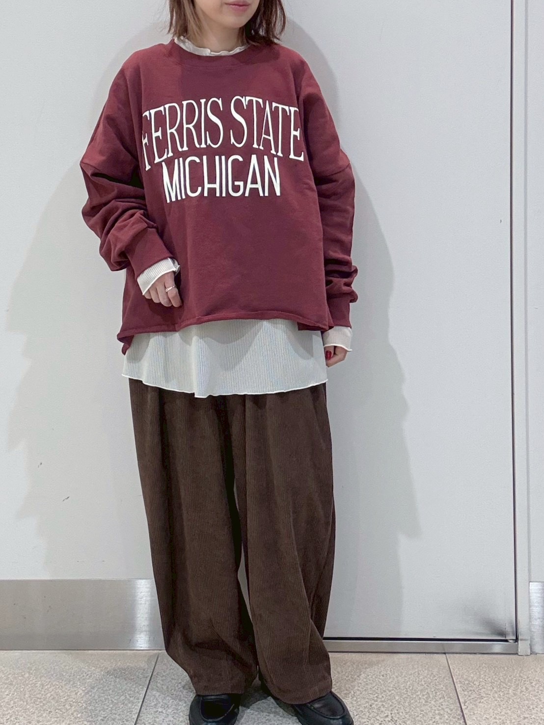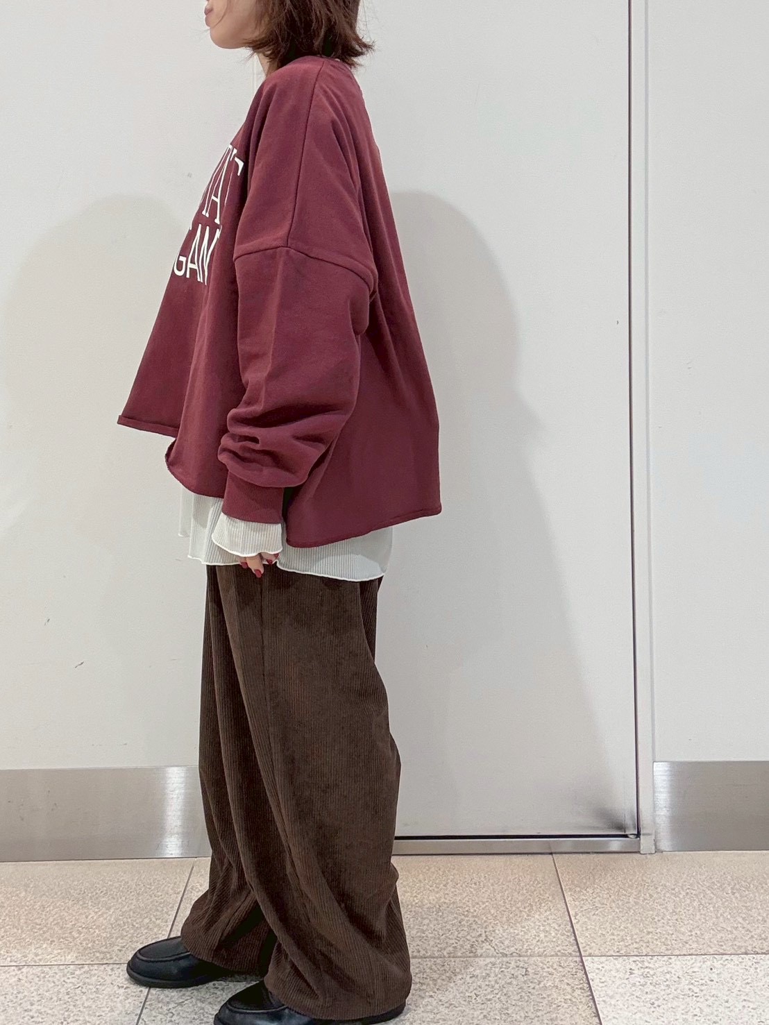 中に合わせたのは、ロゴが可愛い裾切りっぱなしトレーナーにコクーン型が新鮮なポリコールパンツ。