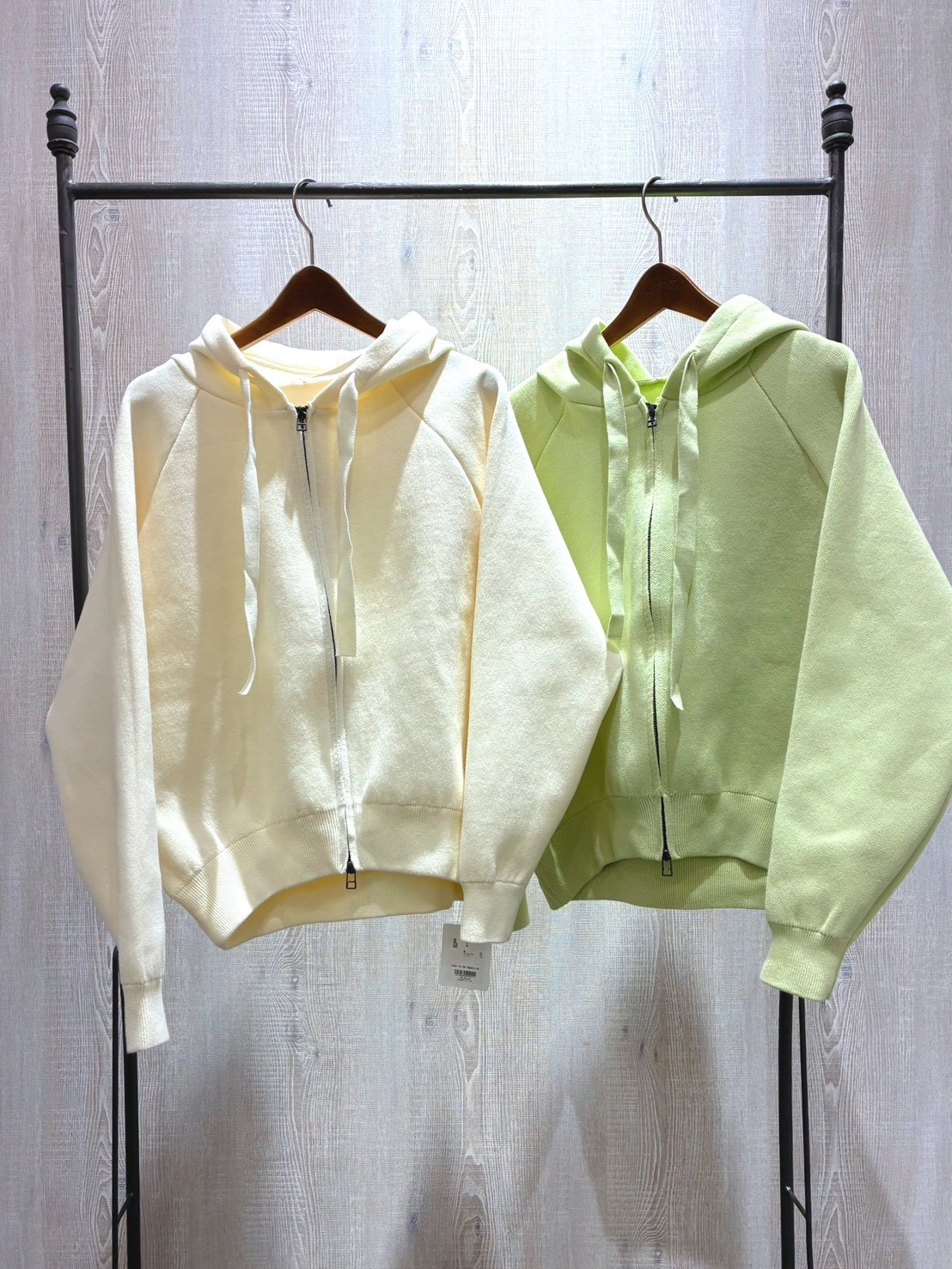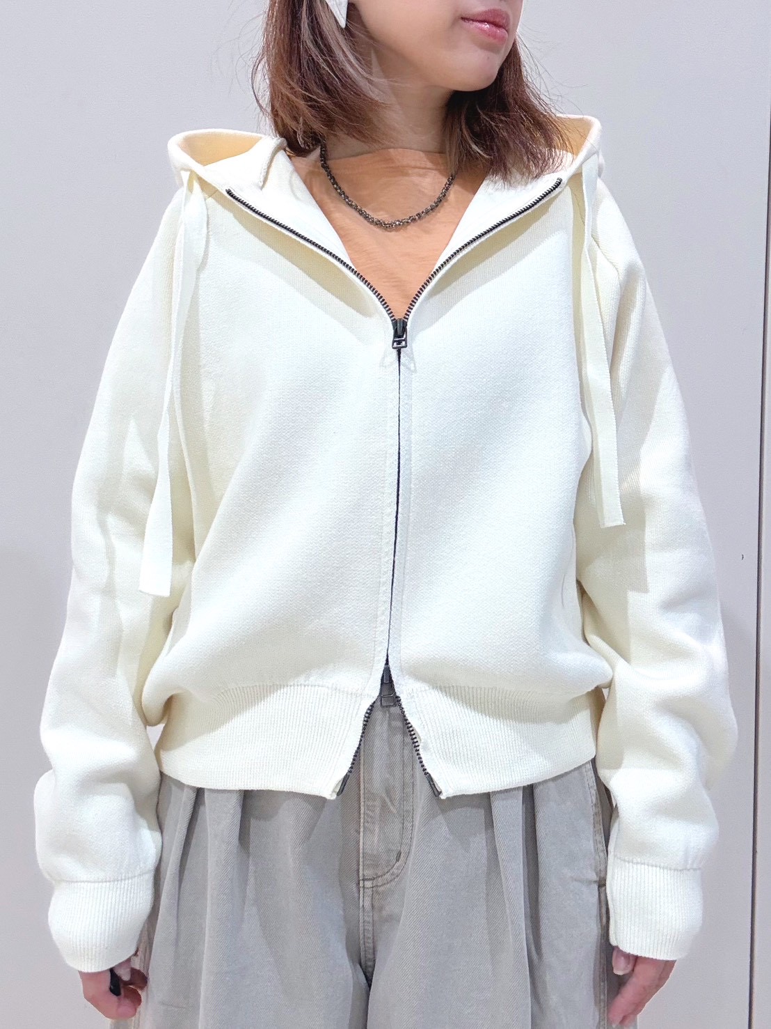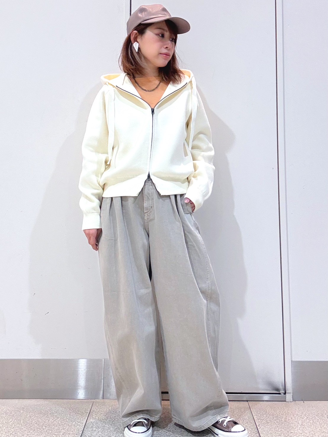 くすみカラーを引き締めるのに、インナーには白さ際立つCLOCHEのニットパーカーとオレンジのプルオーバーを☺︎