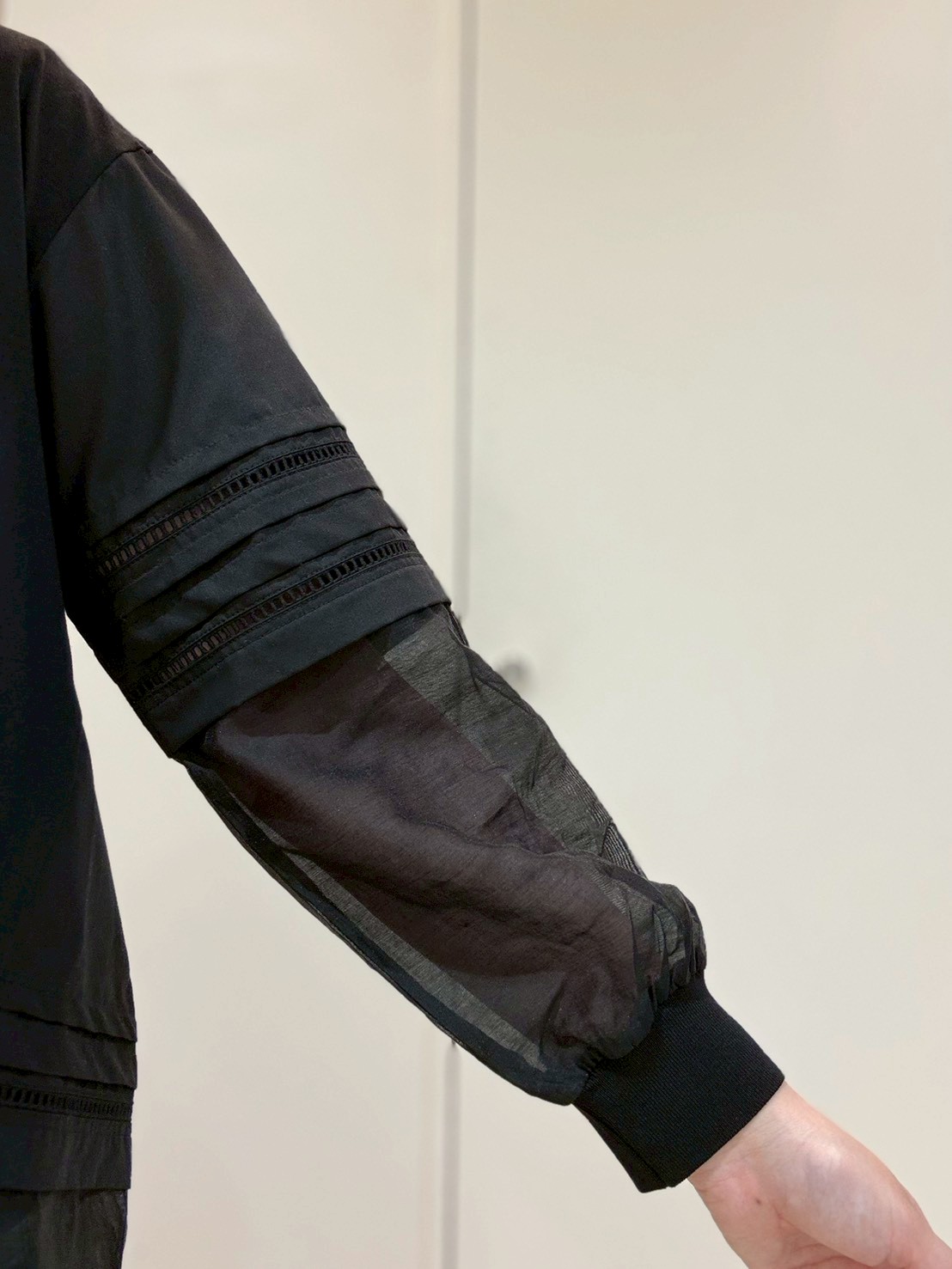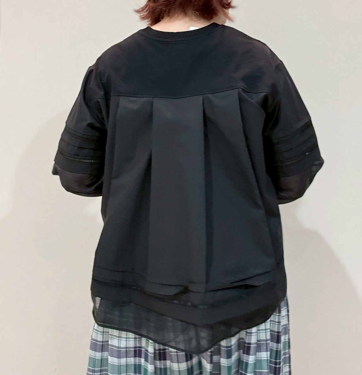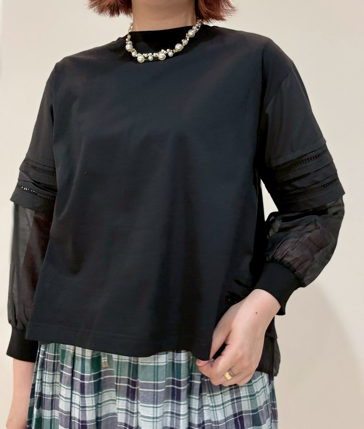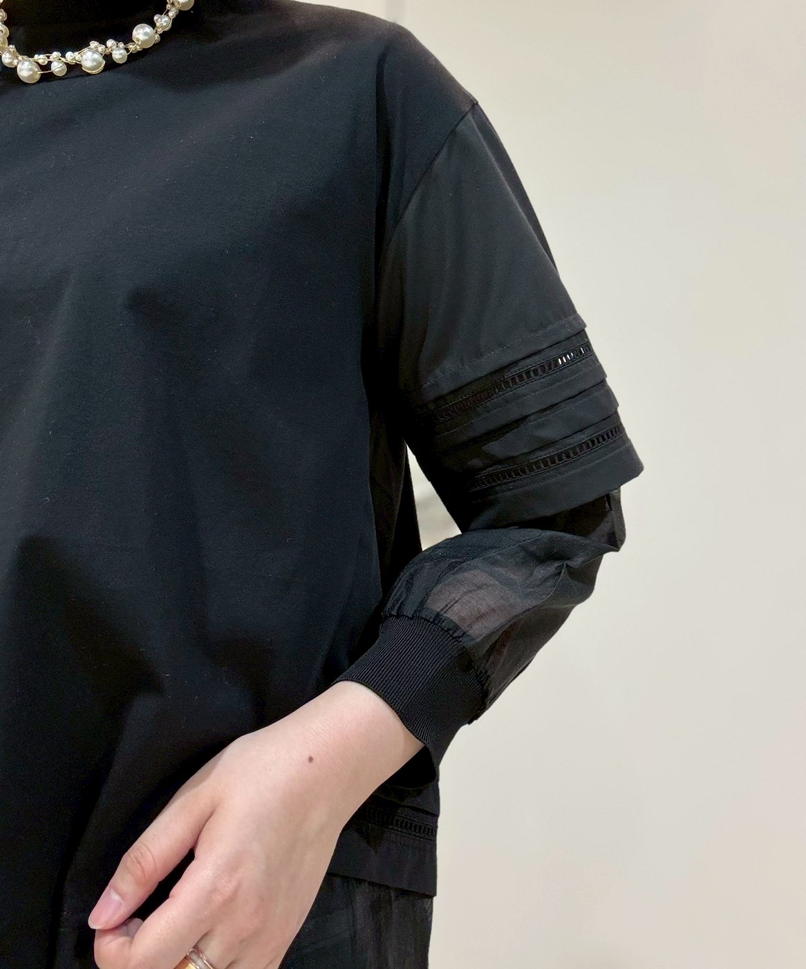 シアー素材の袖がポイントの異素材ドッキングトップス