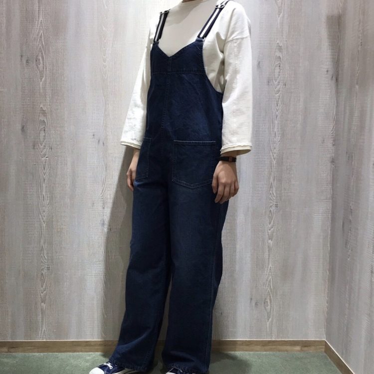 コートの中に着ている【Jhon Bull】のデニムサロペットは肩紐部分がアクセントでストライプになってます!なんとポケットが前と後ろにもあります!