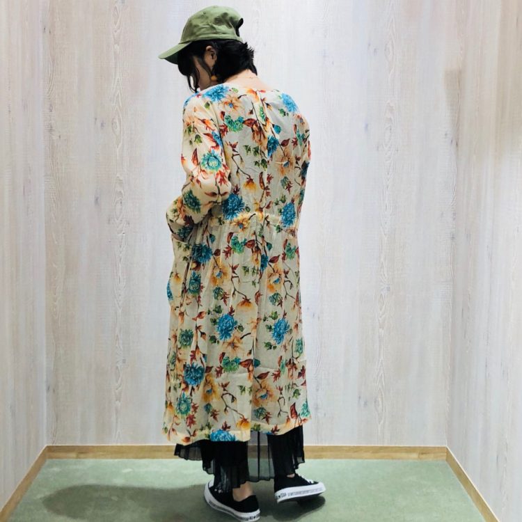 ウエストで切り替えになっているノースリーブワンピースにボヘミアンなお花柄ガウンを羽織って大人コーデに♪