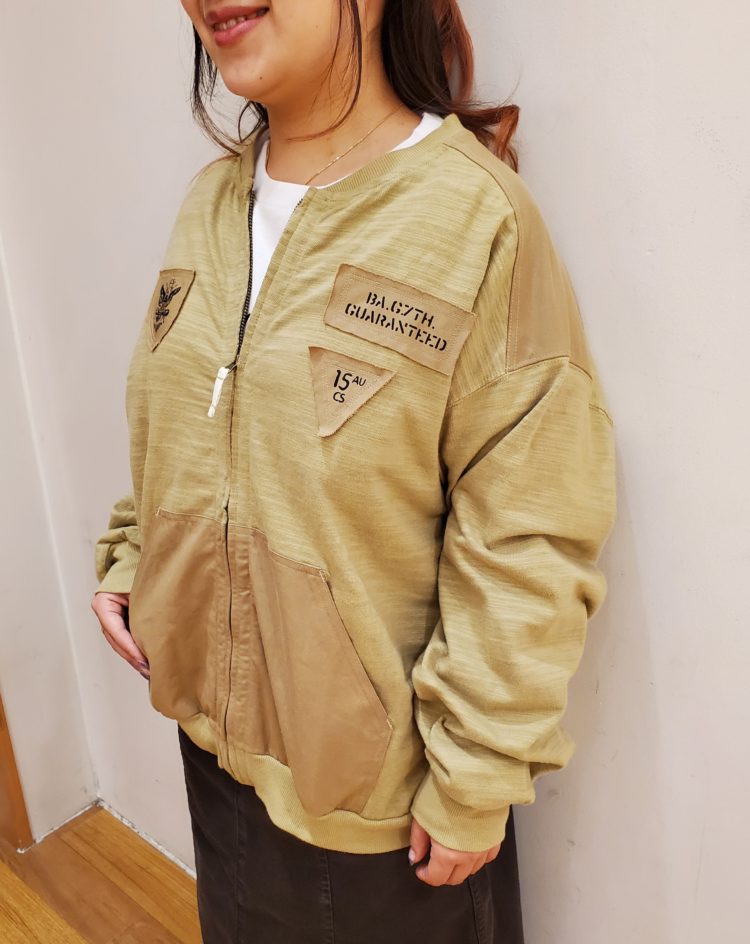 ミリタリー感漂うエンブレムやスプレープリントのパッチワークを散りばめ、リメイク感たっぷり!