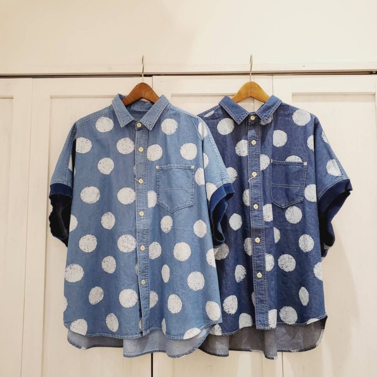 ▷抜染ドットプリント デニム リブ袖 ドルマンシャツ