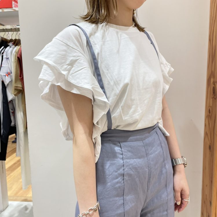 トップスは、ラッフルスリーブのTシャツを
