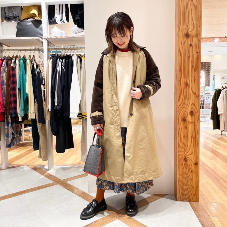 ①ステンカラーコートが主役!ふんわりニット✖️花柄スカートお出かけコーデ