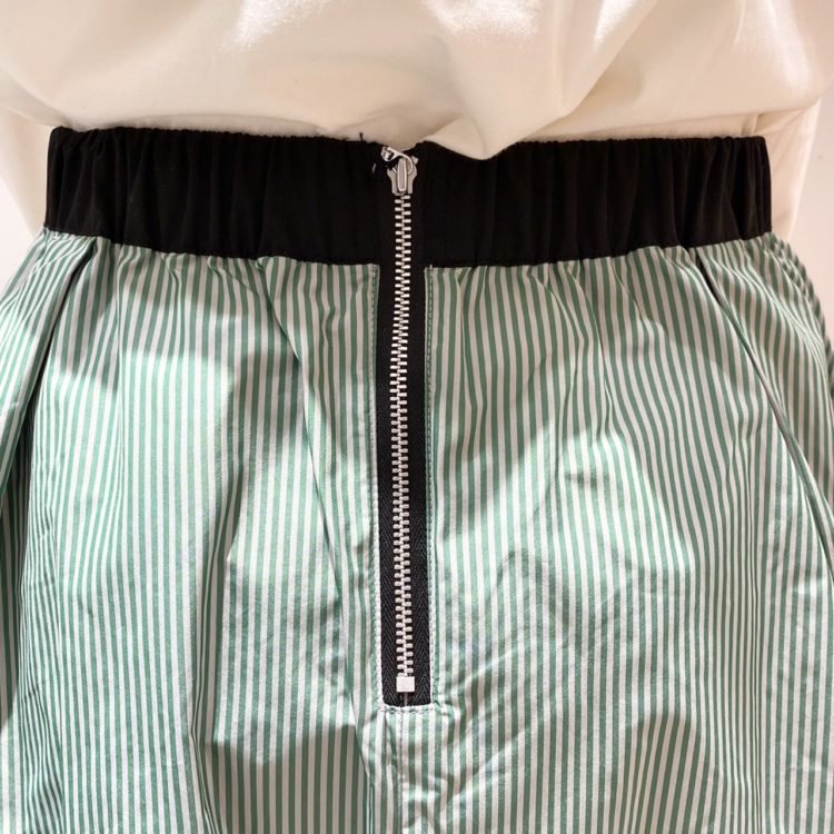 スカートは細いストライプが爽やかで、薄手ながらも張りのある生地で裾に向かって広がるフレアースカートです。