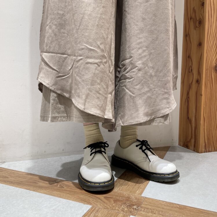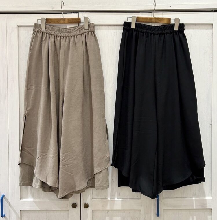サイドにスリットを入れ、ヘムラインを斜めにすることで足元におしゃれなニュアンスをプラス。