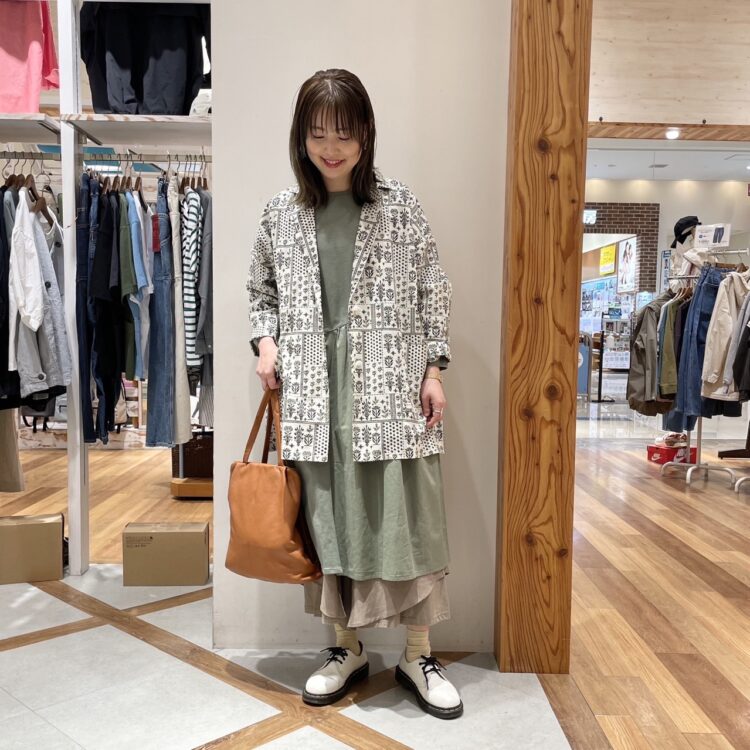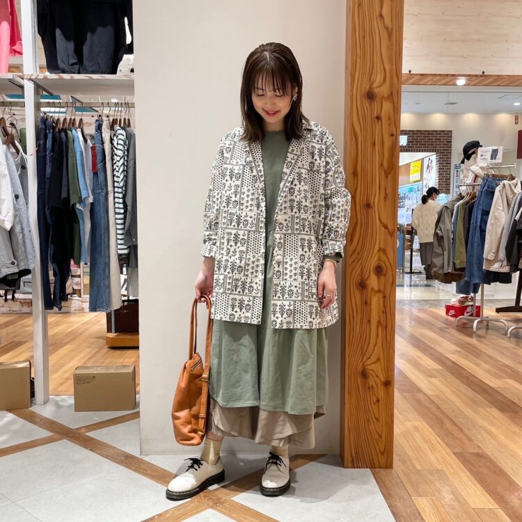 大胆なデザインですが同色でまとめているため、個性が出すぎず着こなしやすい。