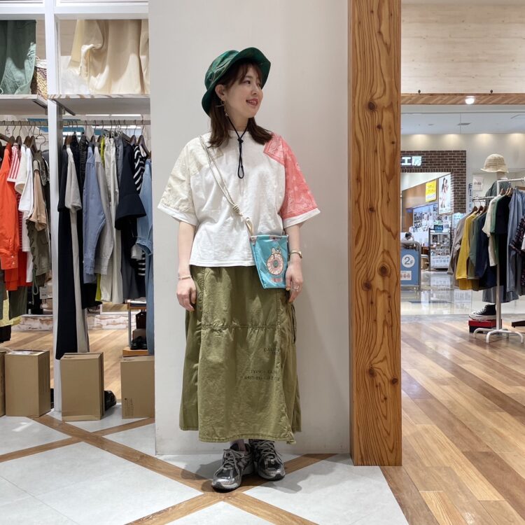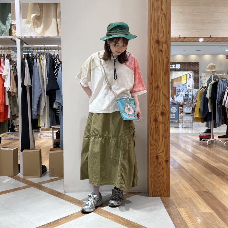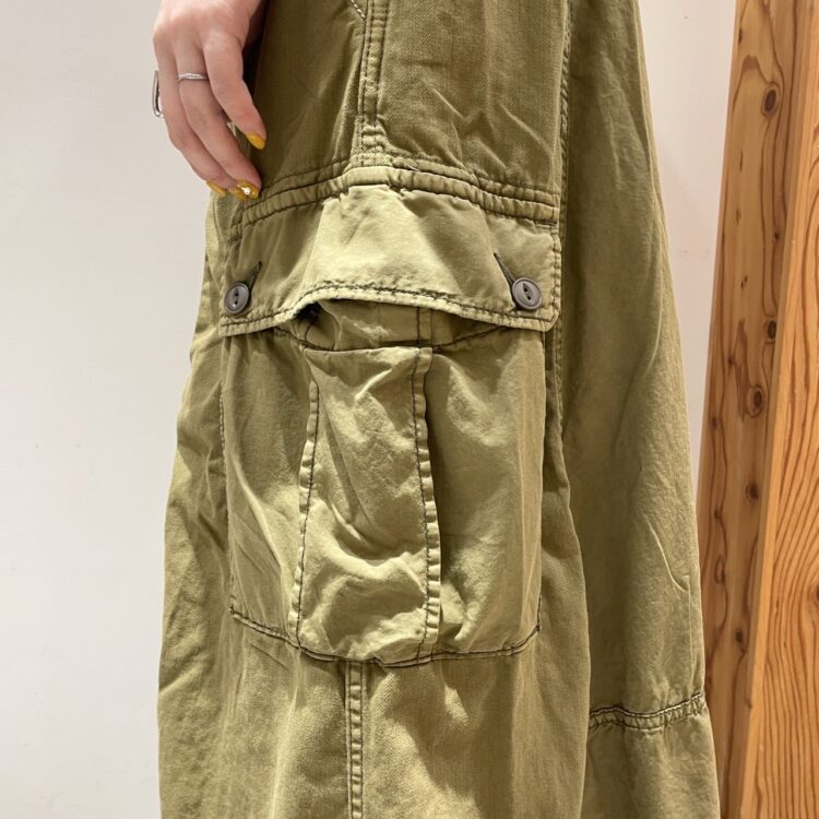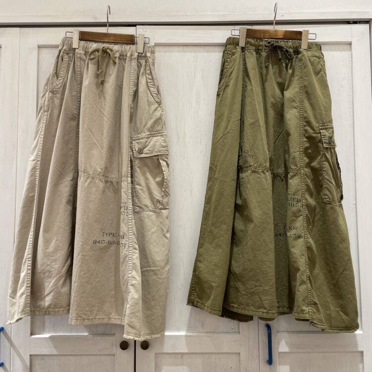 ワークウェアならではのカーゴポケットをセッティングし、ミリタリーのスパイスを味付けしたフレアスカート。