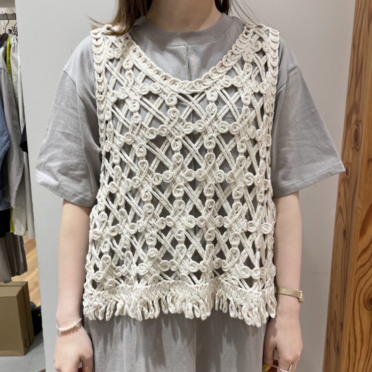ざっくり編み立てた透かし編みが素敵なVネックベストです。