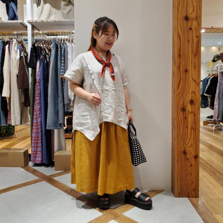 ボリューム控えめで程よい落ち感があるスカートで甘くなりすぎないのが嬉しいポイント✨