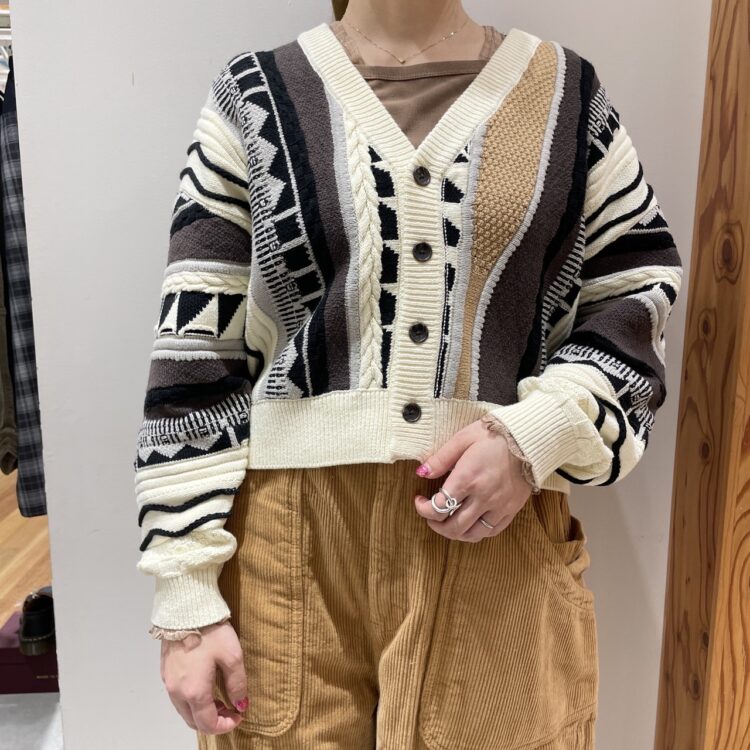 やや短めの着丈で、コーディネートのバランスが取りやすいカーディガンです。