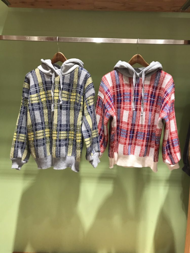 フード部分はスウェット素材、チェック部分はニット素材で異素材なのが可愛い★